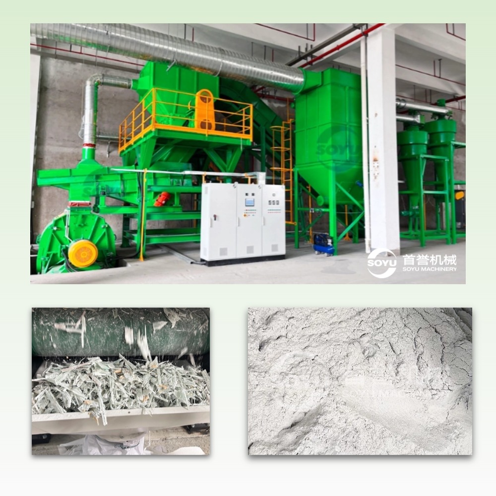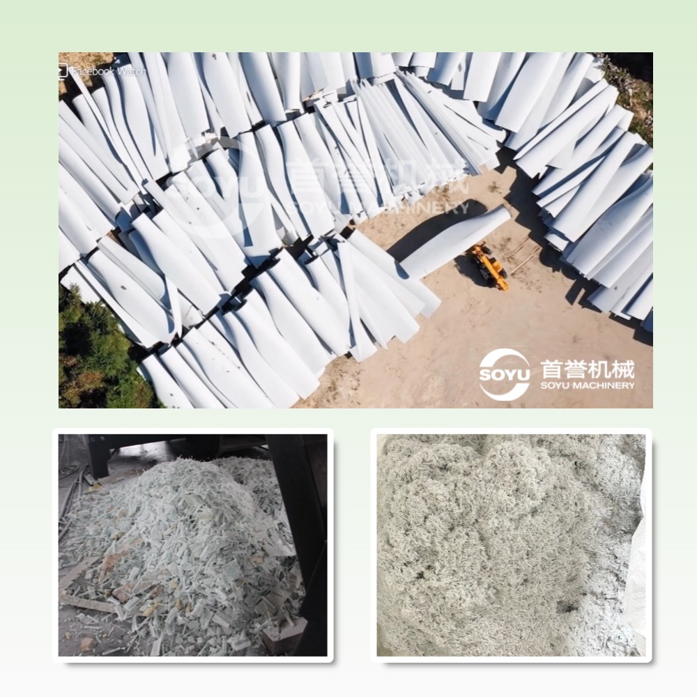 三、技術(shù)突破:智能化與精細(xì)化并行 1. 設(shè)備升級(jí) -首譽(yù)機(jī)械研發(fā)的退役風(fēng)電葉片玻璃鋼制品資源化處置系統(tǒng)等新型裝備,通過增加破碎維度,將出料粒度控制在 200目 以內(nèi),滿足高端復(fù)合材料再生需求。